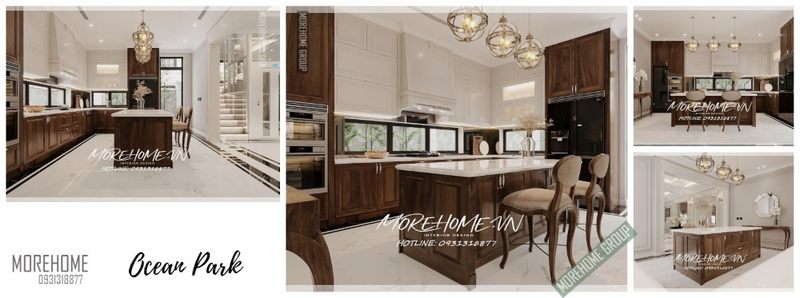 . Không gian bếp được trang bị nội thất có hệ thống tủ bếp phối màu giữa sắc trắng ngọc trai và sắc nâu trầm, đường nét vân gỗ óc chó tự nhiên, chùm đèn kiểu dáng tinh tế độc đáo. Tất cả đó tạo nên một không gian tân cổ điển hoàn mỹ.