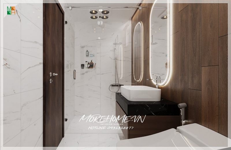 Với đá ốp tường phòng tắm và màu sắc đặc biệt, không gian nhà tắm đã tạo nên ấn tượng mạnh mẽ về tính thẩm mỹ.